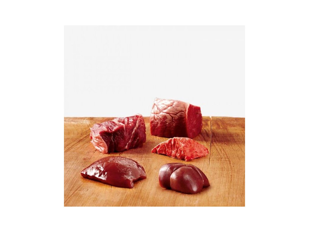 68 % hovädzie mäso (srdce, mäso, pľúca, pečeň, vemeno, obličky), 29 % hovädzí vývar, minerálne látky, svetlicový olej.