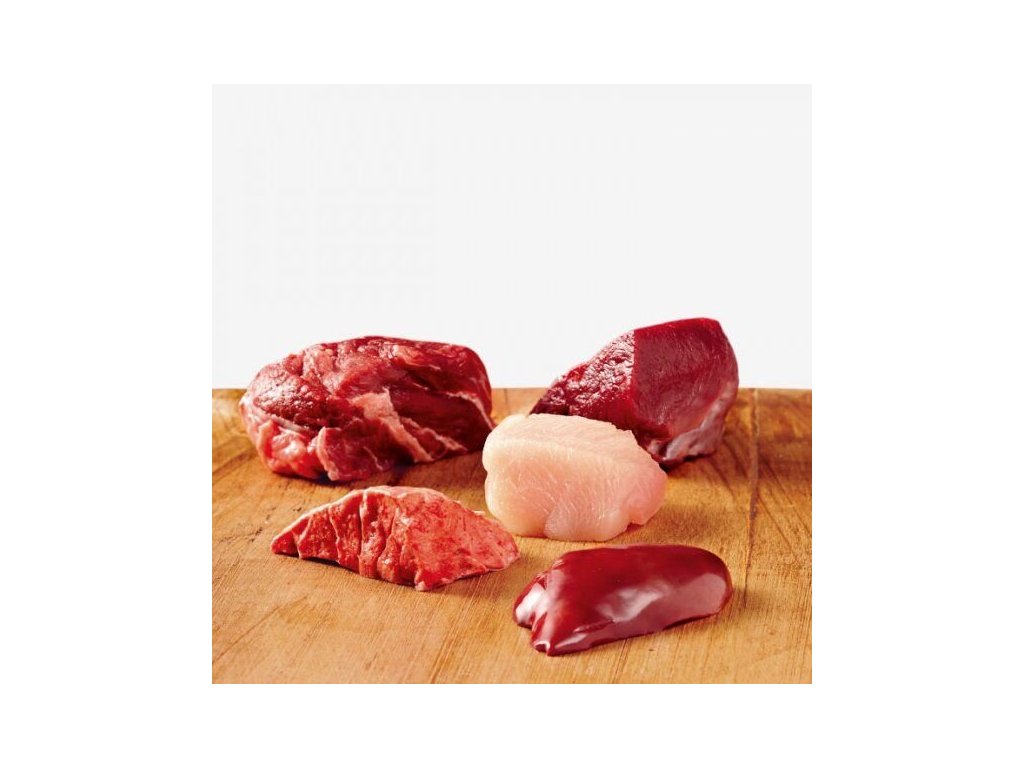 38 % hovädzie mäso (pľúca, pečeň, mäso, srdce, obličky, vemeno), 30 % kuracie mäso (mäso, srdce, žalúdok, pečeň, krk), 29,5 % hovädzí vývar, minerálne látky, svetlicový olej.