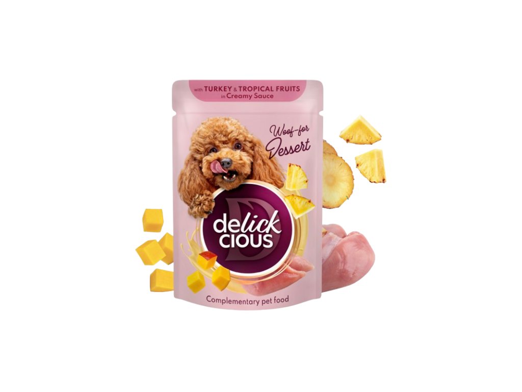 Kapsicka DELICKCIOUS™ ADULT DOG s morcacim a tropickym ovocim v smotanovej omacke 80g