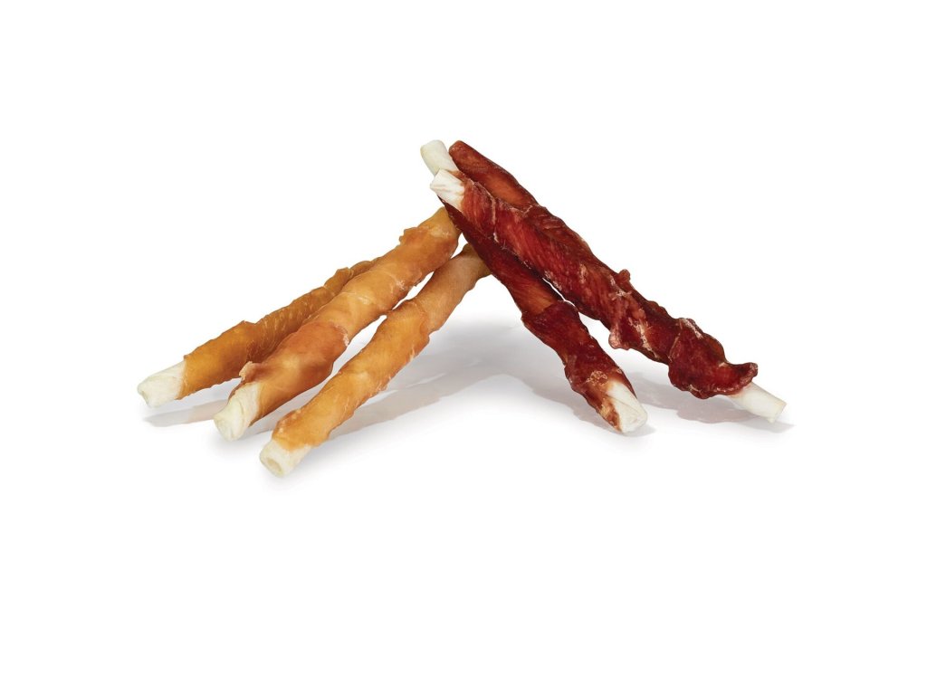Surová byvolia koža obalená kuracím a kačacím mäsom.