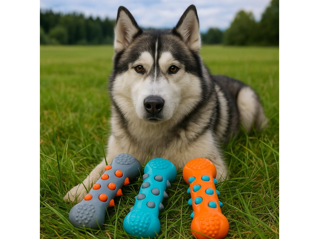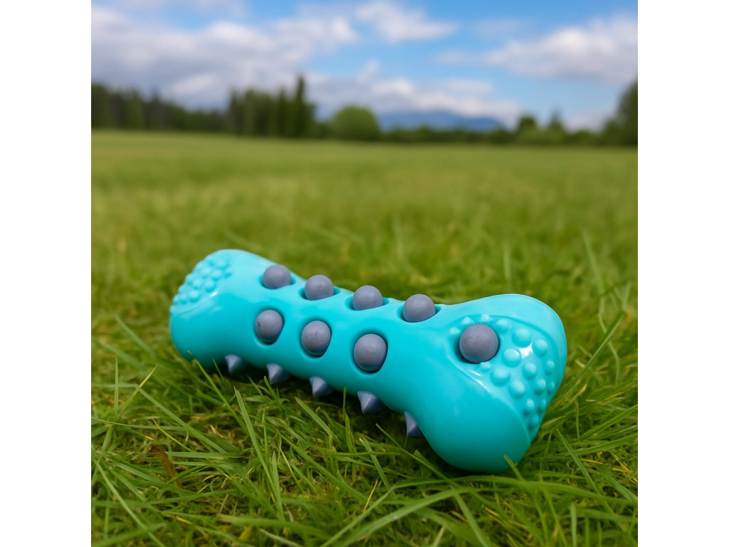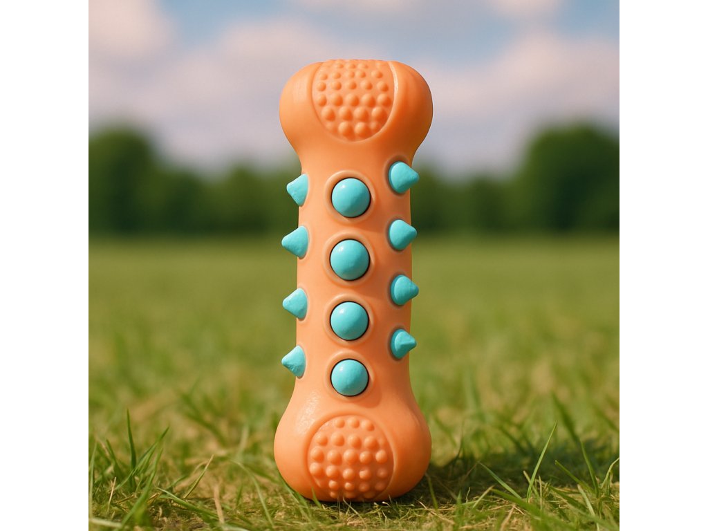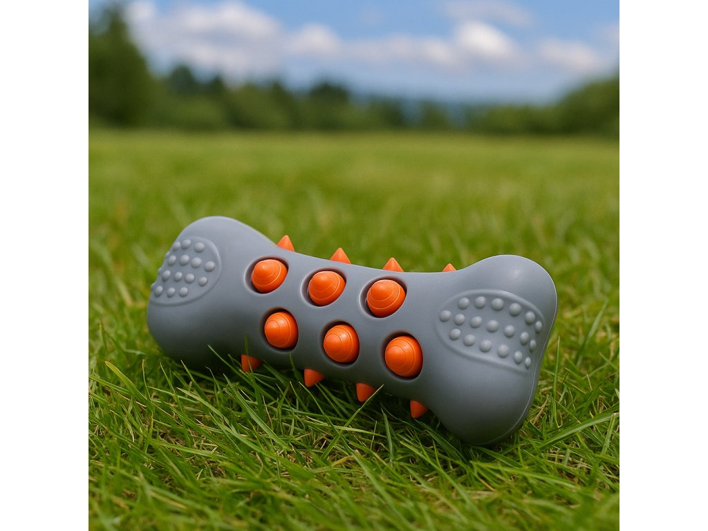Odolná gumená hračka pre psov 🐶 v tvare kosti s pískadlom, ktorá poteší každého štvornohého kamaráta. Povrch s mäkkými gumovými ostňami masíruje ďasná, čistí zuby a zároveň podporuje hravosť psa. Ideálna na aportovanie, žuvanie aj tréning.